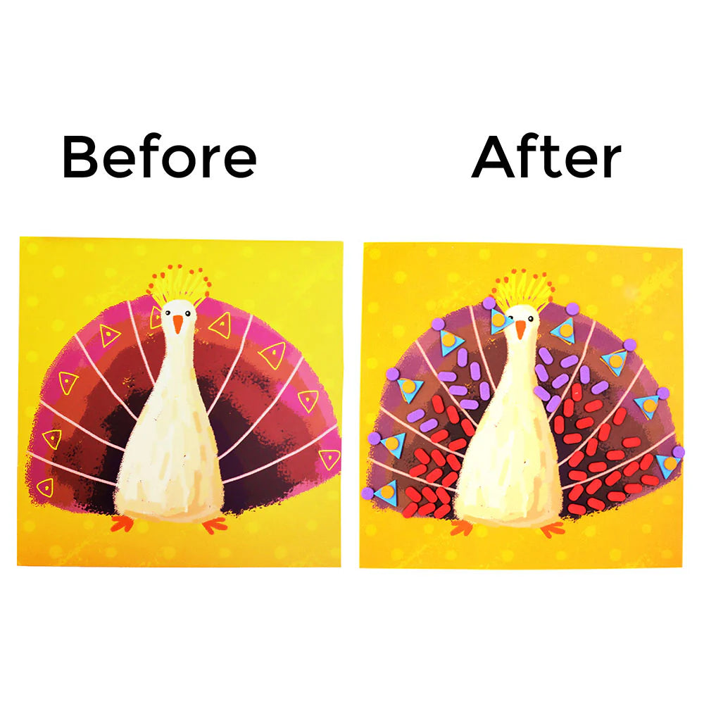 - Pack Includes - 8 Animal Boards with a tortoise, peacock, butterfly, hen, cow, snail, chameleon, and hedgehog design. EVA foam stickers in different shapes like hearts, triangles, circles, and more.