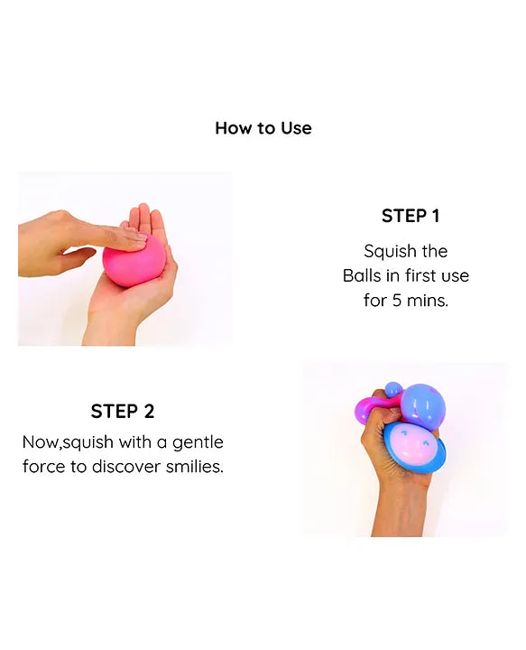 - How to Use : Squish the Bliss Balls gently for 5- minutes. Once Squishing is done, Squeeze to discover different smiles and moods. Watch the colors getting transformed as you squeeze the ball, revealing different smiley faces with various moods. Each squeeze brings a new surprise!