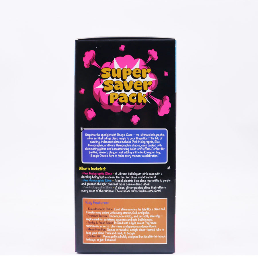 Scoobies Boogie Ooze is a magical, glittery slime set made to delight little hands and curious minds! This fun trio includes Pink, Blue, and Pure Holographic slimes, each with a beautiful rainbow shine that sparkles as kids stretch, squish, and swirl.