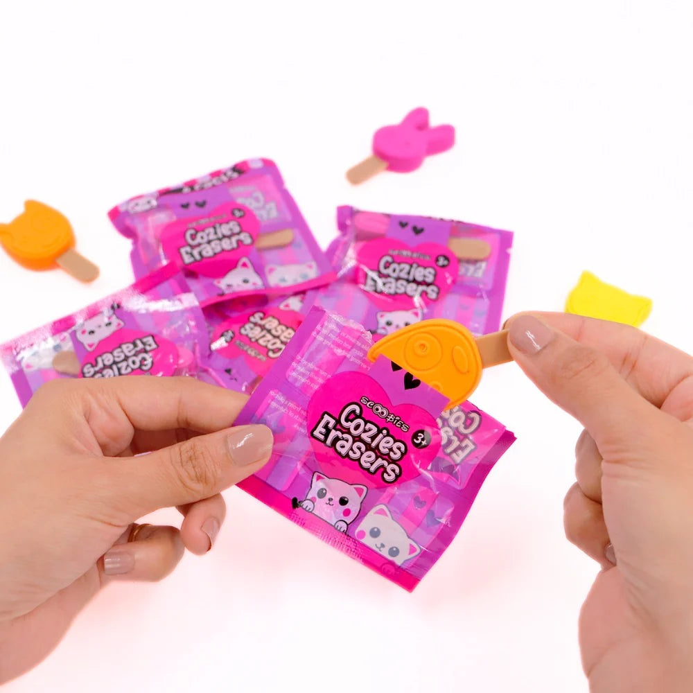Pack Includes - Purple Bunny Cozy filled with a set of 4 erasers. Erasers come in 4 different colors (orange, yellow, pink, and purple) and in 4 animal-themed ice cream shapes (dog, cat, bear, and rabbit)