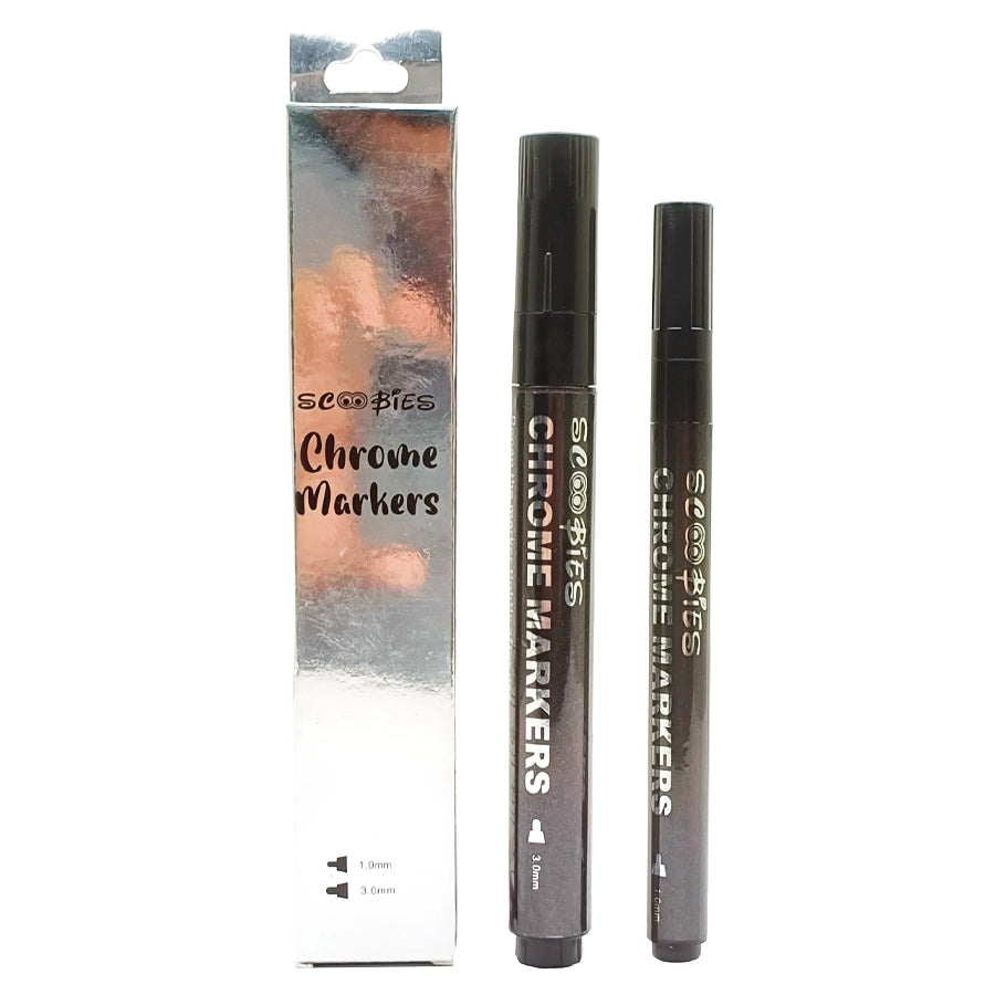 This set of 2 Chrome Markers works well on smooth and non-porous surfaces giving a rich high-gloss mirror effect to your regular art with its silver opaque metallic ink.