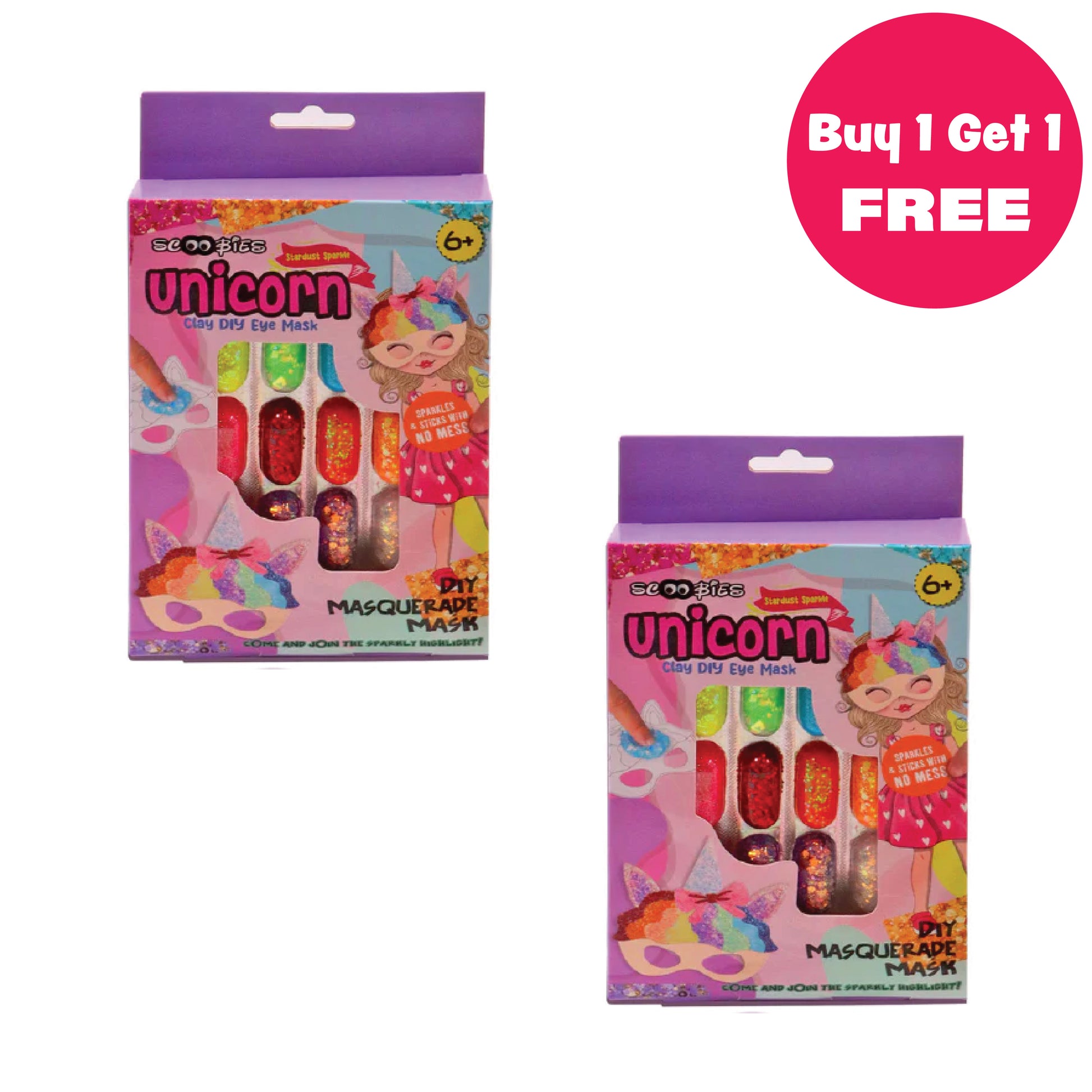 Pack Includes - Unicorn-themed mask, yellow-colored crayon, 1 plastic stylus, 12-multicolored shimmery clay, string and an instruction manual.