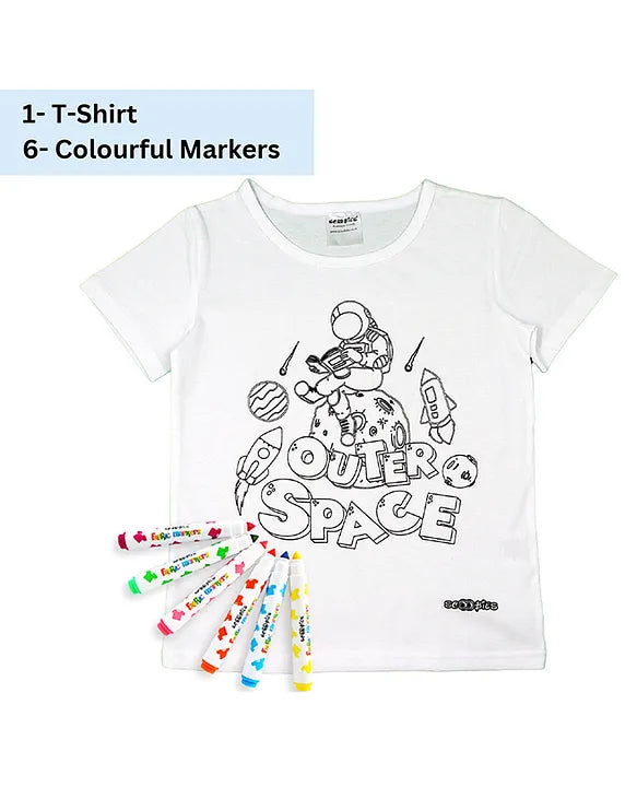 - Pack Includes - 1 Outer Space Doodle white colored T-shirt, 6 fabric markers (dark blue, red, yellow, light blue, orange, and green), and 1 orange card.