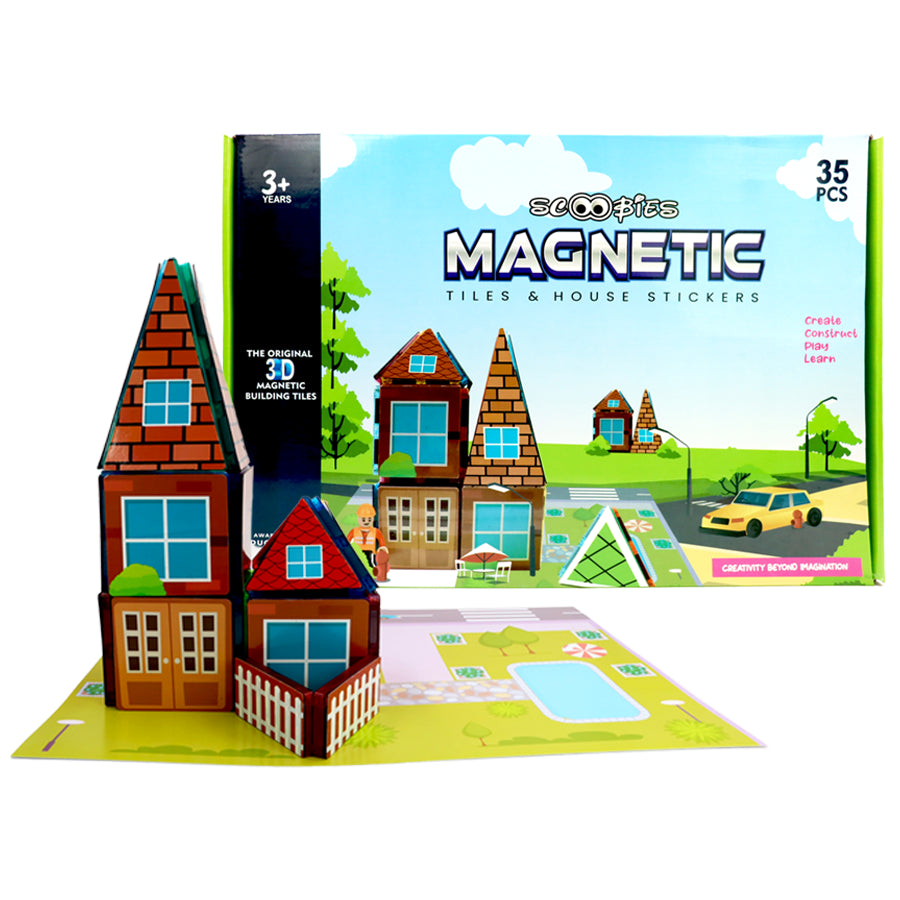 Scoobies Magnetic Tiles & House Sticker Set brings kids close to imagination & creativity. Let kids create their DIY houses, rooftops, buildings & more with these interchangeable building blocks & stickers. Construct! Play! Learn!