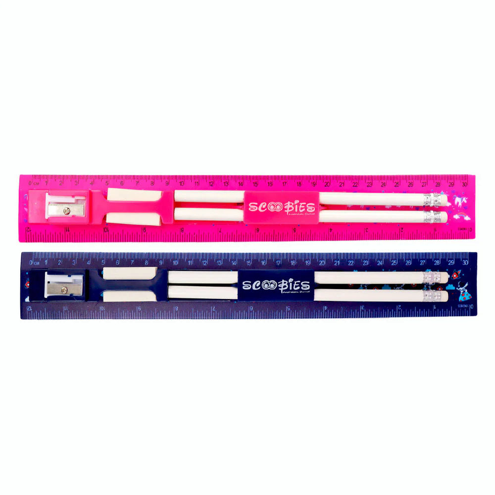 New in Scoo-town, this is a complete ruler, pencil, eraser & sharpener set. Perfect for carrying in exams!