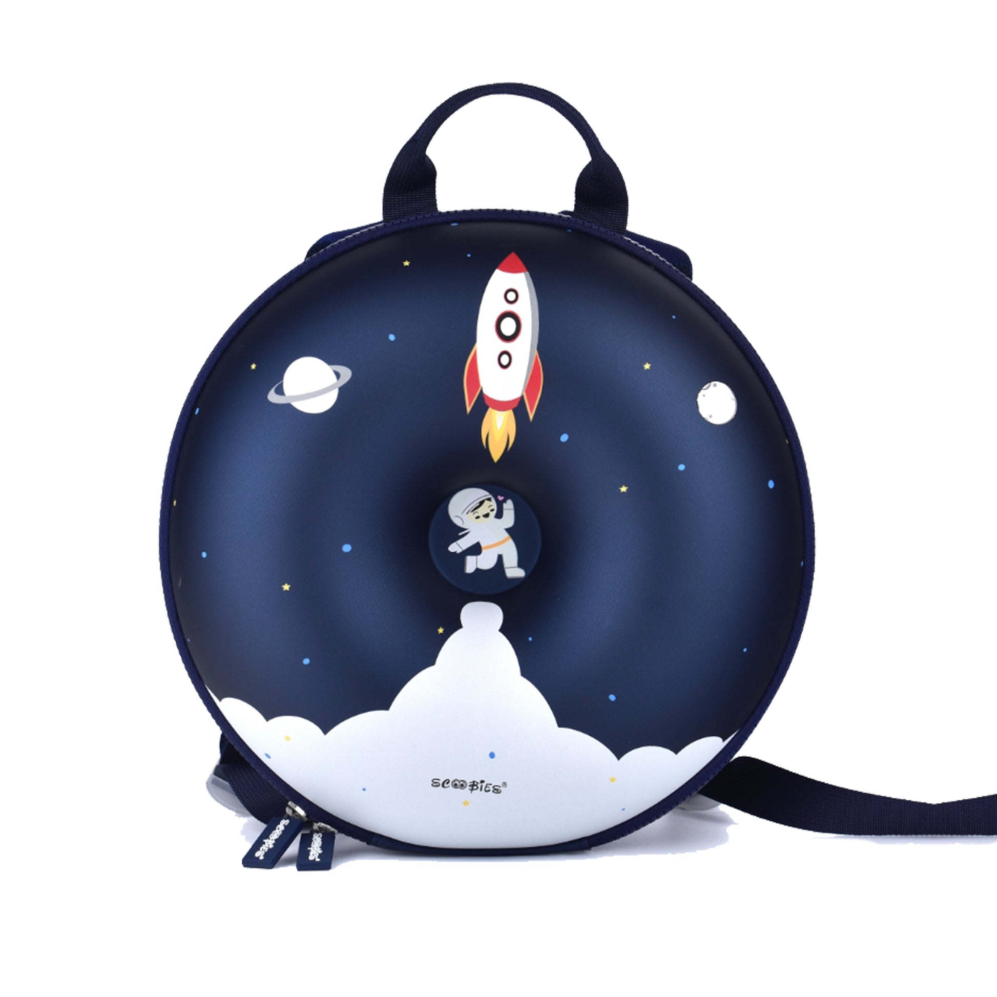 Let's leap into the world of stars, sun, moon & space in this quirky spacecraft donut. Made with premium EVA quality, it comes with mesh padded adjustable shoulders and a non-slip chest strap buckle. It is a lightweight and comfortable bag for little astronomers.
