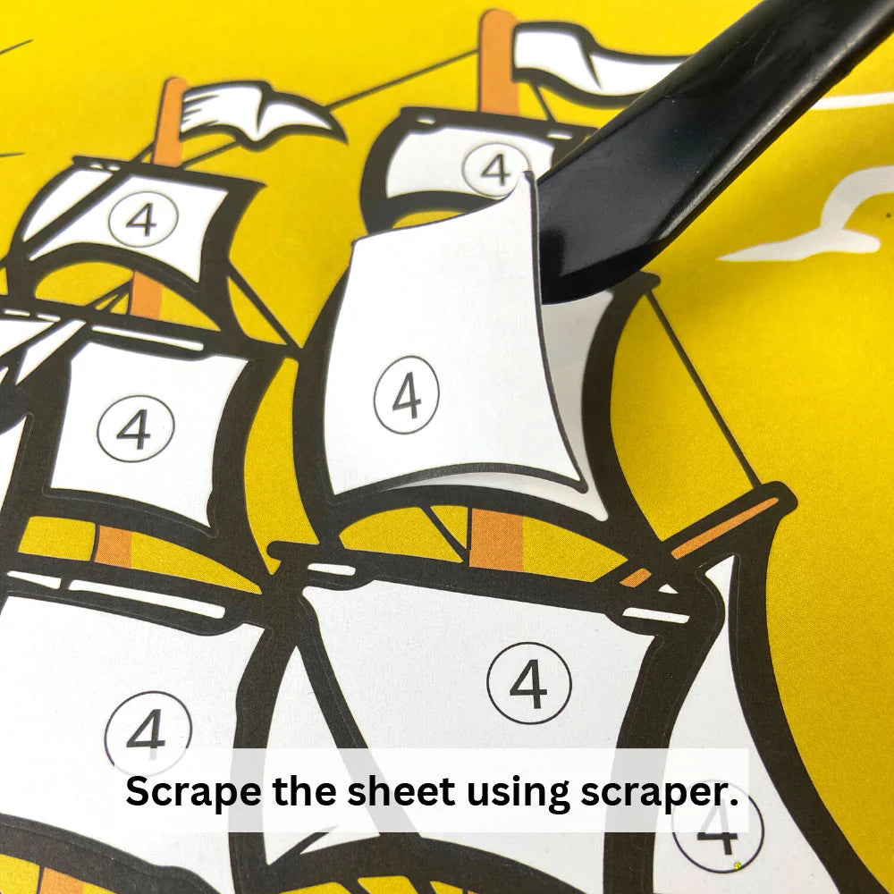 - How to Use - For every number, there is a corresponding glitter. Pick up a design card of your choice. The entire composition is divided into different numbers. Peel the number using the spatula and use the same spatula to pour the corresponding glitter and stick it on the required part using the brush. No glue or scissor is required!