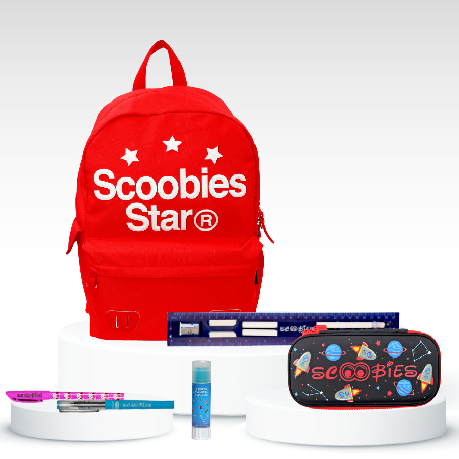 Pack Includes - Scoobies Be a Star Bag (Red), Rocket Space Pencil Case, Rule the Ruler (Blue), Gluestick ( Blue), Owl Gel Pen, and Power Gum Gel Pen.
