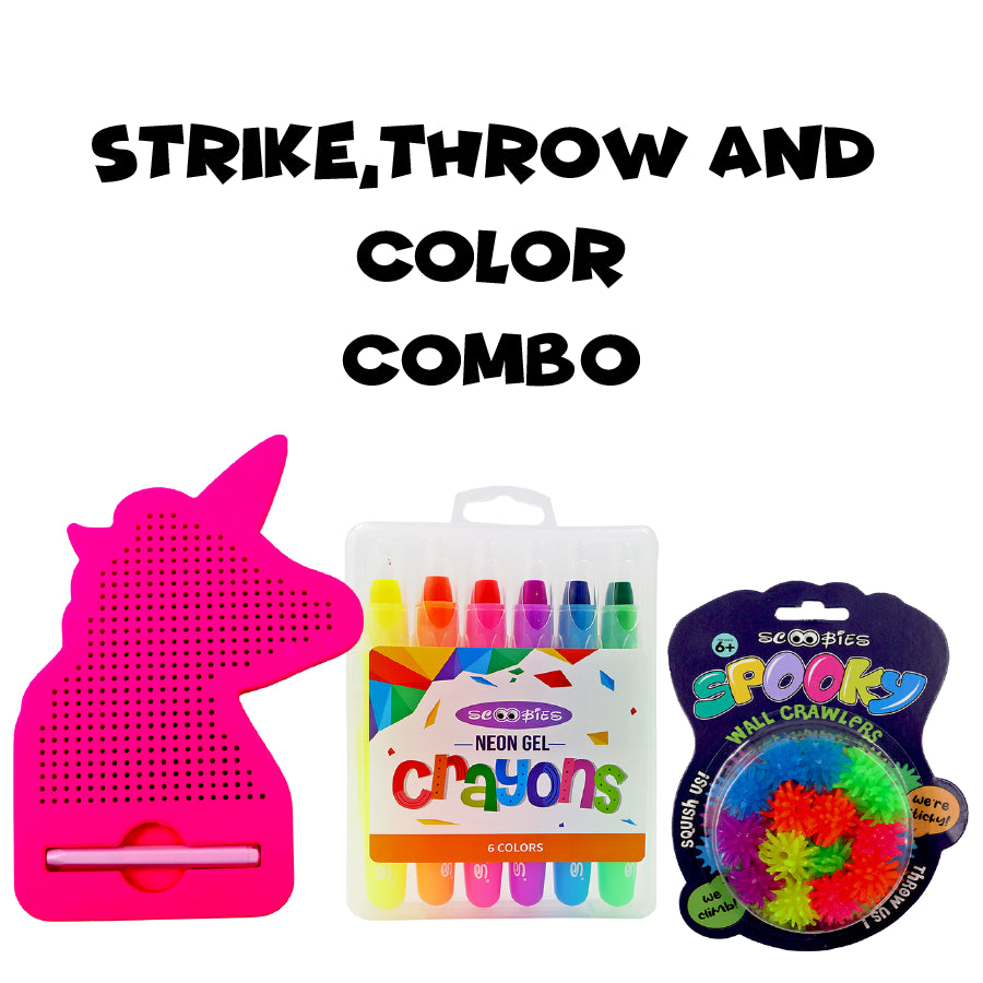 This combo has everything to make your kid happy in & out. Scoobies brings Strike, Throw & Color Combo to engage your munchkin indoors or while on the go!